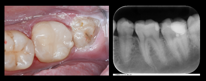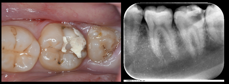 写真左:術前の口腔内写真 写真右:術前のレントゲン写真