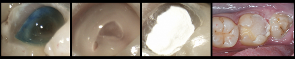 写真左・中左・中右:う蝕検知液をもちい虫歯:う蝕を除去除去していくと歯の神経(歯髄)まで到達。ダイヤモンドチップにて歯の神経(歯髄)を切断。切断面の確認。生理食塩水にて止血後、MTAにて直接覆髄。メガボンド2(クラレノリタケデンタル)をもちいてコンポジットレジンにて封鎖。