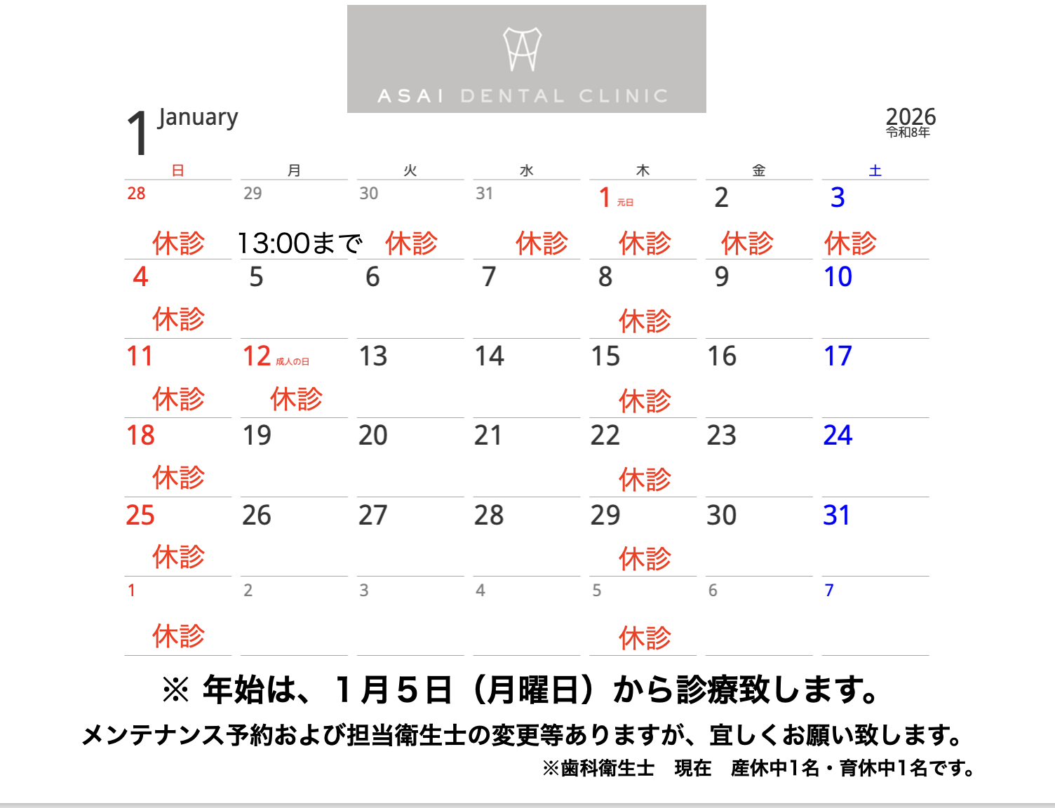 <1月の診療日および休診日>